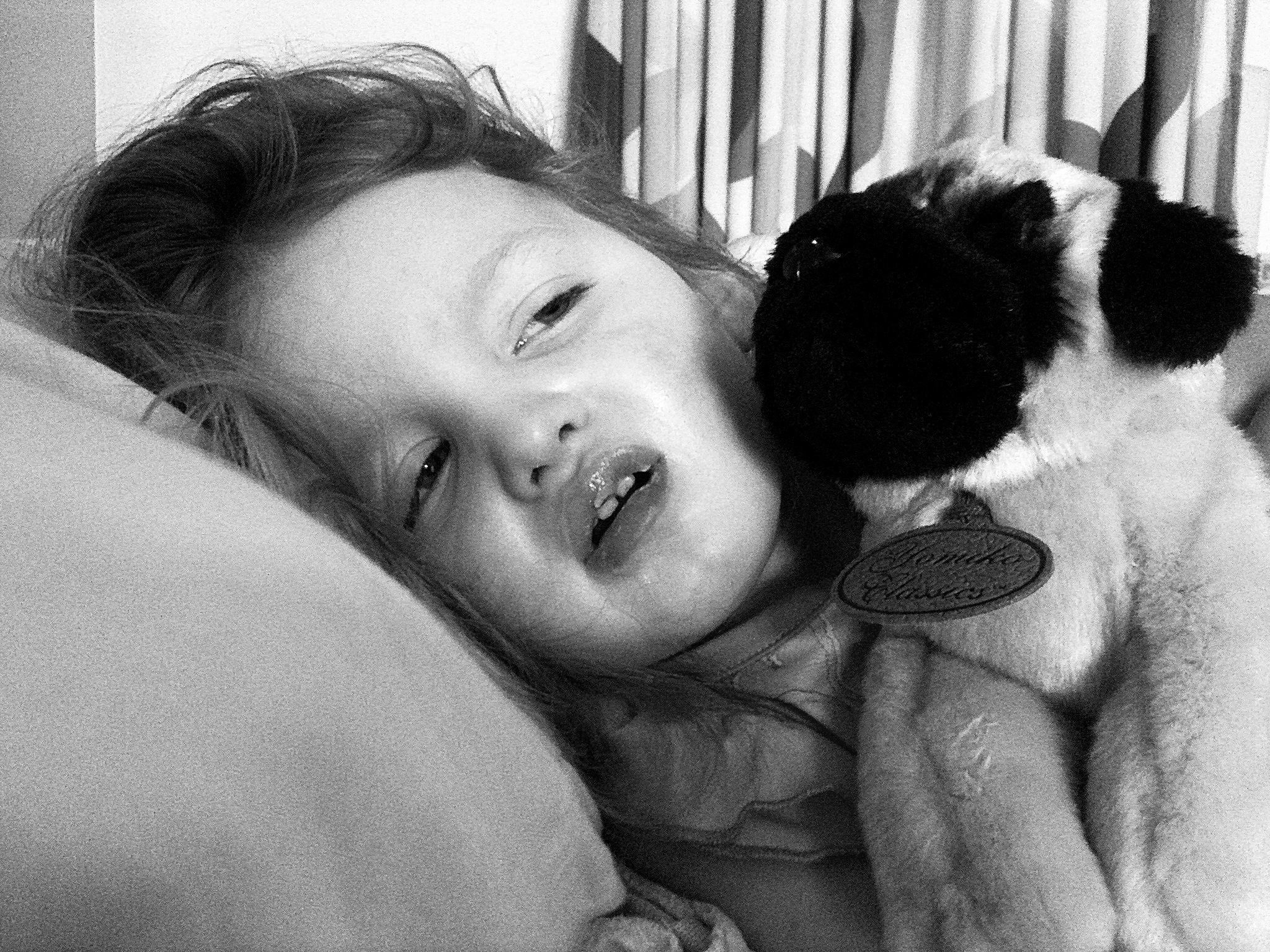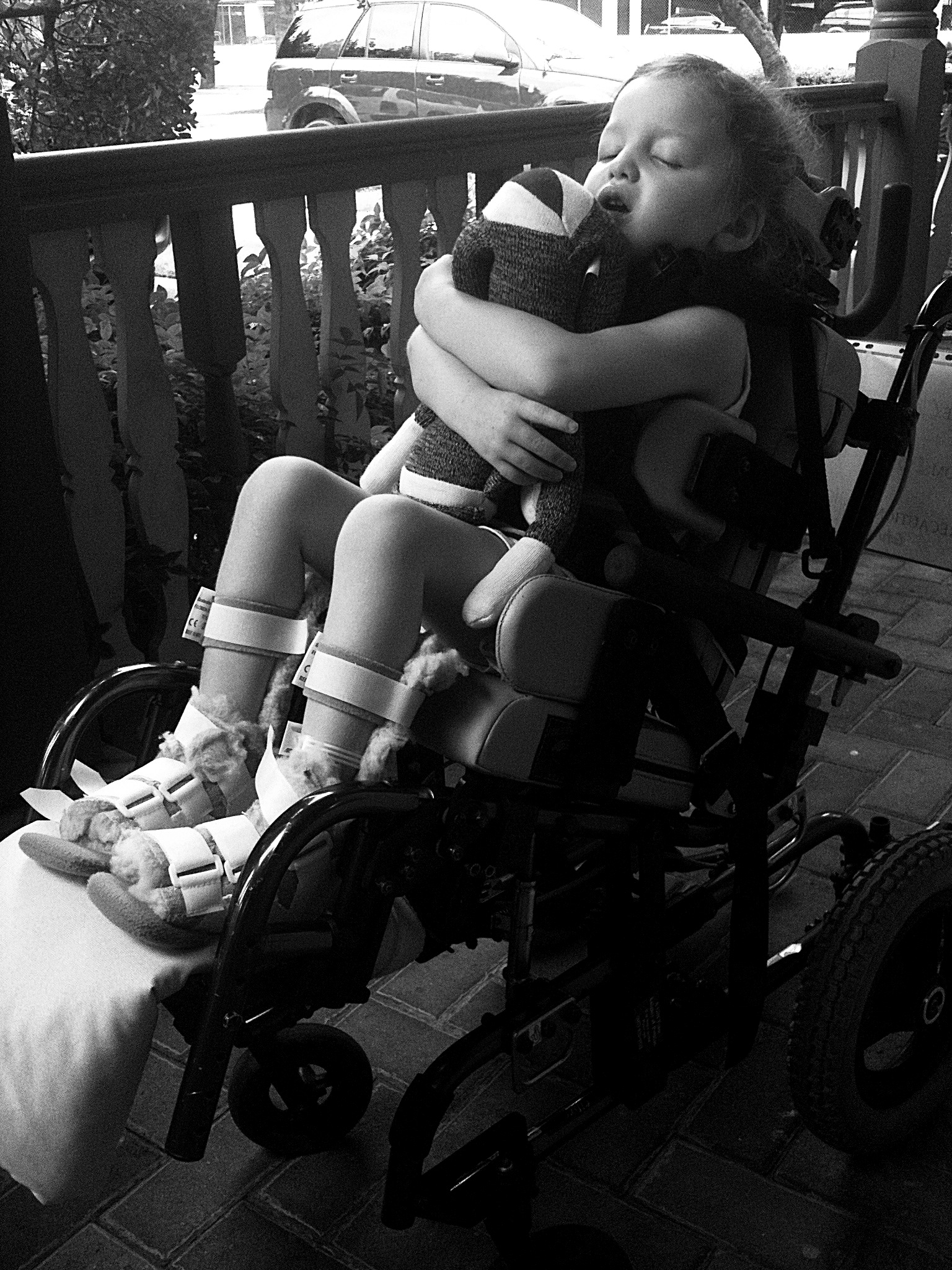 Thank goodness she’s sleeping now. It took a while and my arm is tired from patting her back, but she’s sleeping soundly. I can hear her breathing – which keeps me from getting up to check – and she’s been going strong for almost an hour. We’ve got the beginnings of a system to make it through the nights and we hope it diminishes volatility through the nights. It will help her stay strong for her therapy sessions.
