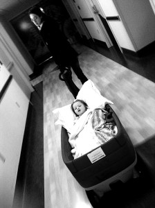 We met with the doctor this morning and he insisted that we get Claire out of her bed. They laid out that we needed to hold her and give her a wagon ride around the unit. It sounded like a good idea to us. It was.