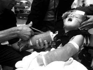We had to cut the casts off after they set. Claire wasn’t a fan. The saw was noisy and the vibration was odd. She protested despite plugging her ears for her.