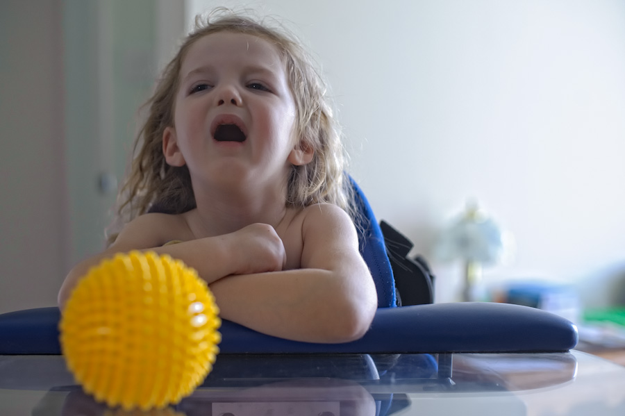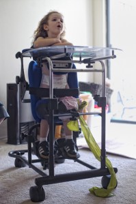 We got tired of waiting for the replacement knee pad to arrive for Claire’s standing frame. So we fashioned our own. Claire was having a tough morning. She was responding to leg stretches and we wanted to see if putting some weight on her legs would alleviate some of the pain. It did. Claire stayed in the standing frame for just over 30 minutes and was calm and collected the majority of the time. She was also much more subdued after she came off the frame. We were so encouraged by the results we put her back on the frame this evening when she was getting agitated again. She calmed down again and stood for another 30 minutes. We intend to use the frame on a daily basis now and hope it will produce recovery results for Claire.
